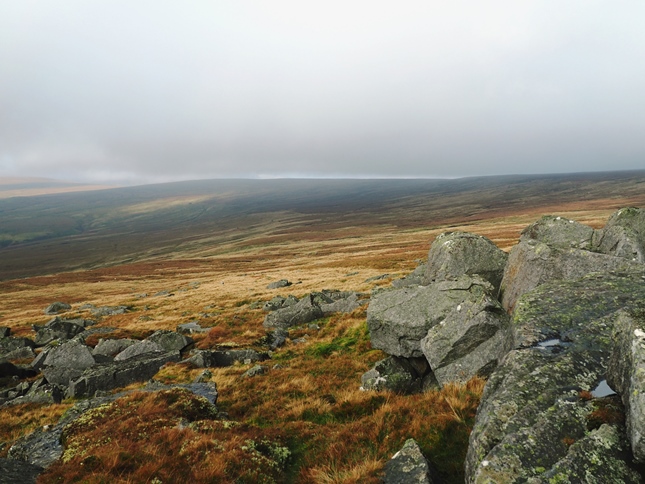 From Flushiemere House we continued a bit further along the beck side until we became embroiled in dense bracken. At this point we decided to make a beeline for a rash of boulders we could see on the skyline above us to the right. After a steady pathless climb these rocks proved to be the northern end of Carr Crags. At this point the sun began to tentatively break through the gloom overhead and it was in the shelter of the rocks that we decided to sit and have our lunch before making the final push on to Westernhope Moor.