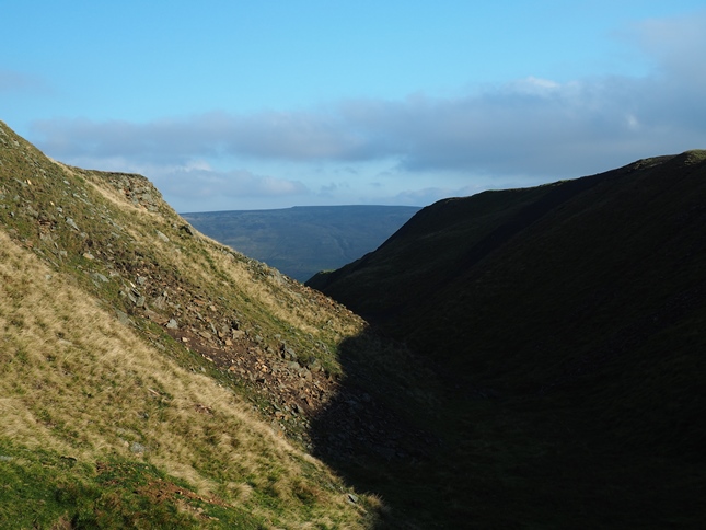 At Weather Beds we crossed through a gate and suddenly there was a nice grassy track for us to follow south along the ridge. This was a superb section, easy underfoot and with increasingly fine views of Teesdale as the sun finally began to win its battle with the cloud. Continuing on we passed an old mine reservoir to suddenly arrive at the dramatic cleft of Coldberry Gutter.