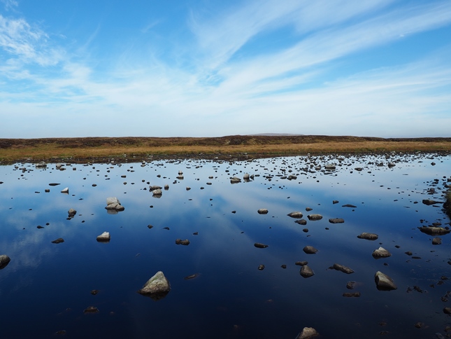 From North Edge we climbed gradually to another couple of curricks before crossing a particularly peaty area to reach an attractive shallow tarn littered with rocks. From the tarn it was then a short walk up to the small cairn marking the summit of the fell. Here we sat down to enjoy our lunch and a spectacular view across the cloud covered Eden Valley to the top of Helvellyn.