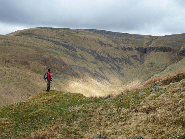 By this time I'd dropped down to the bridleway that climbs over the north flank of Cross Fell between Garrigill and Kirkland. Descending gradually towards the latter I had a panorama of Lake District fells directly ahead of me. The highlight of the descent though was the arrival above the small valley of Ardale and some dramatic views to the head of the valley which is called Black Door.