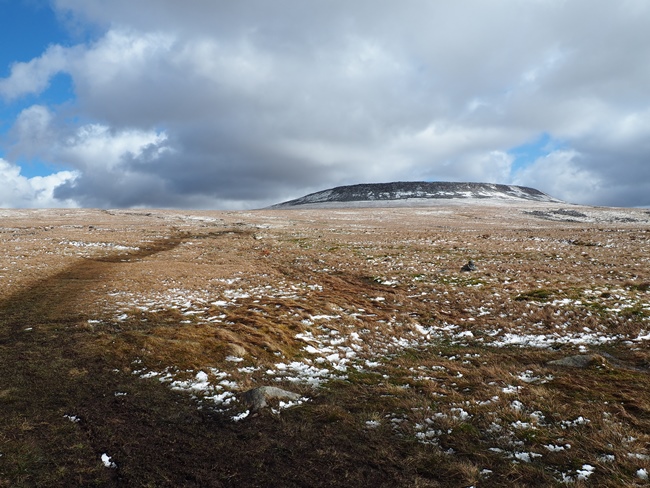 Continuing on across the narrow Cringle Moor I passed the remote farmhouse at Wythwaite. A gradual climb up the side of Grumply Hill above Littledale Beck then brought me to the steeper slopes of Wildboar Scar. Visibility was superb and looking back beyond Blencarn I could clearly make out a host of Lakeland fells with Blencathra the most prominent. After a steep pull up above Wildboar Scar the bridleway became fainter. At the same time the views of the neighbouring North Pennine tops began to open out. With a white veneer from some overnight snow both Little Dun Fell and Great Dun Fell looked particularly impressive.