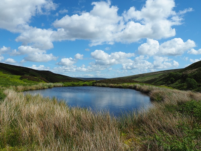 After finishing my lunch I continued on up the valley and after passing the path climbing over into Hudes Hope I didn't see anymore of the Durham Dales walkers and all was quiet again. My aim was to walk up the valley as far as the waterfall marked on the map as Black Force. The waterfall proved to be something of a disappointment but ample compensation was had by discovering a lovely little, reed-fringed, tarn just above the beck.