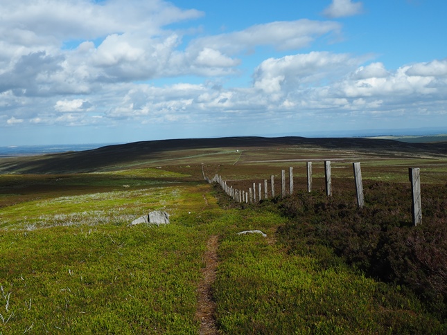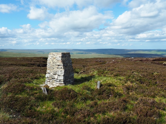 From Black Force I next had to negotiate pathless slopes of bracken, heather and moorland grass. Eventually, and somewhat wearily, I arrived at the fence running along the top of Harnisha Hill and which also marks the Tees - Wear watershed. A short way along the fence I came to the stone built trig point on Harnisha Hill, or Raven Seat as it is called on the OS trig database. The views, which very much favoured Weardale to the north, were excellent with the northern Dales tops in view along with the Cleveland Hills south of industrial Teeside.