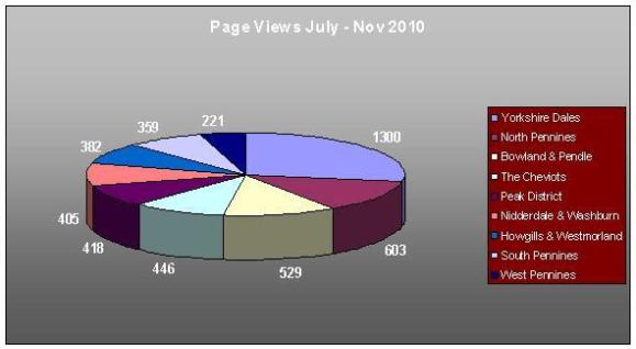 I was always quite interested in seeing which of the Pennine areas would be most popular on the site. The chart below showes the number of page views the content of each section of the site has received between July and November 2010. Unsurprisingly, considering this section has by far the most content, the Yorkshire Dales is well out in front. Similarly the West Pennines has the least content and subsequently the least page views.