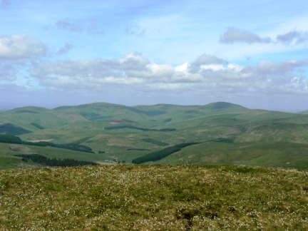 Looking south and south-west it is possible to see at least as far as Mickle Fell and Cross Fell in the North Pennines as well as the Northern Fells of the Lake District. With the exception of a small portion which is hidden by The Cheviot nearly all the Cheviot hills can be seen including the numerous foothills on the Scottish side of the border. In the distance behind the Scottish Cheviots can be seen the outline of the Southern Uplands.