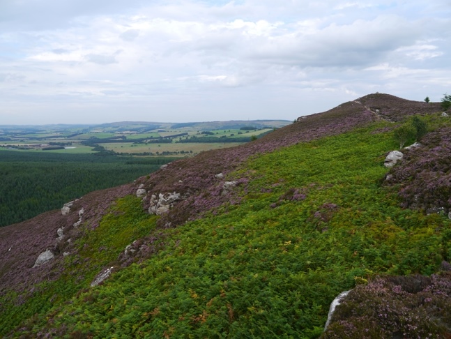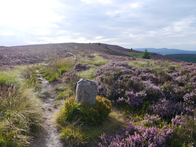 The path round to Long Crag was most pleasant especially with the surrounding heather in full bloom. The path largely stayed well clear of the crags themselves so all in all Long Crag proved to be rather less memorable than Coe Crags. There was however a trig point which was briefly illuminated by the early evening sunshine at the same time as ominously dark clouds appeared overhead.