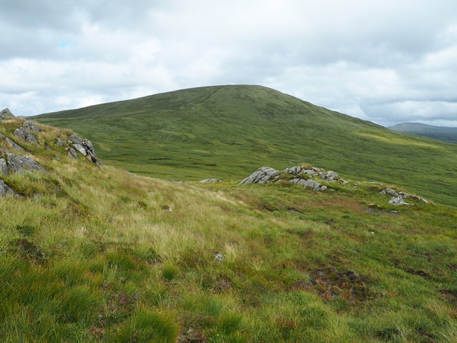 From the top of Bennan I followed the access road from the mast a short way before crossing over a deer fence via a large wooden step stile to eventually rejoin the path heading for Merrick over the grassy slopes of Benyellary. The moment I reached the large cairn marking the summit of Benyellary was a memorable on with Merrick suddenly appearing ahead and views over the Galloway hills really opening up.