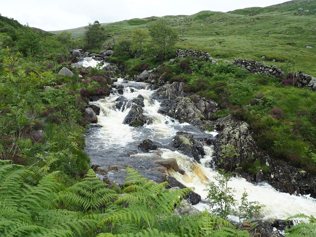 The first few miles of the walk were notable for how wet the path was (a taster of things to come) and for the sound of waterfalls in Buchan Burn most of which were not visible from the path due to bracken. As the path climbed a bit higher a brief moment alongside the burn provided a nice interlude. About this point I also started to notice clumps of yellow flowers which I later found out were bog asphodel.