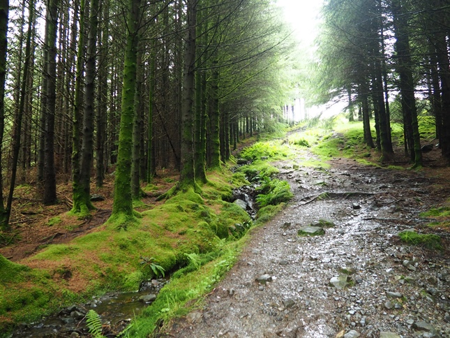 The path eventually climbed away from the burn to reach the dubious shelter of Culsharg bothy which now seems to be missing its door and windows. Above Culsharg a steeper path carried me up through the plantations above Whiteland Burn. At the top of the plantation a plaque on the ground announced the transition from the forest zone to the montane zone. As I climbed higher the views began to open out behind me and the Minigaff hills appeared above Buchan Hill. Small patches also began to break through the cloud.