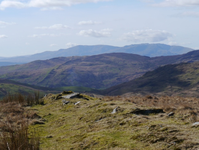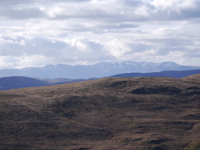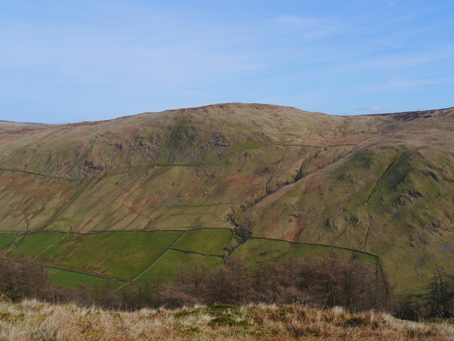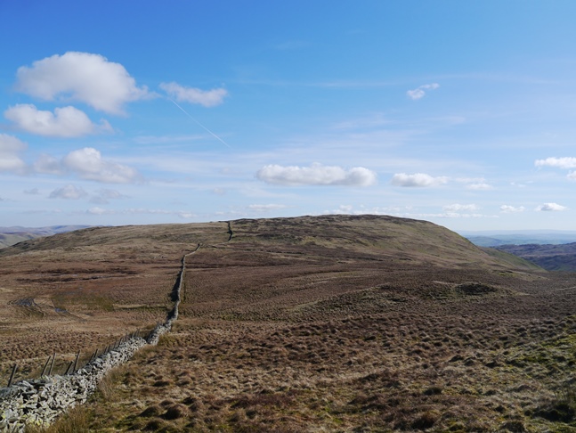A similar thing could also be said of the next top, which at 555m was the highest point of the walk. Described by Wainwright as a nameless summit, and called 'Ancrow Brow' by Birkett the top is listed as 'Swinklebank Crag' on the Database of British Hills. The top was marked by a neat cairn on the west side of the fence. The views were extensive and included, in the Lake District, Black Combe, the Coniston Fells, the Scafells, the Ill Bell Ridge and, just across Long Sleddale, Kentmere Pike and Harter Fell.