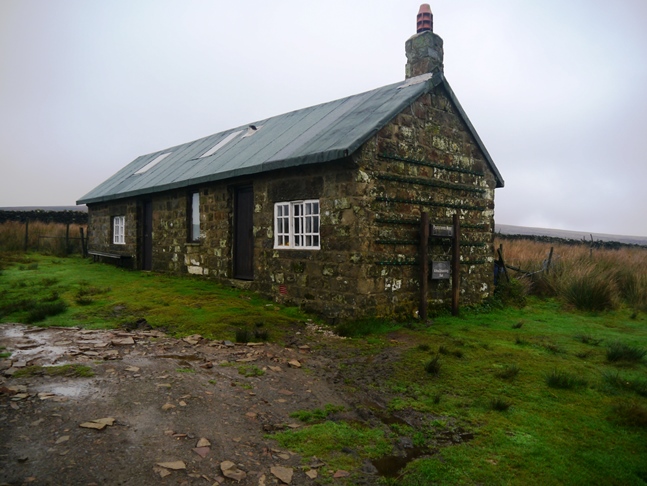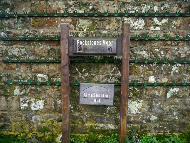 We followed the track over another bridge crossing the river and on to Alma Shooting Hut. A nice sign proclaiming the name and location of the hut was offset somewhat by the garish hooks decorating the whole of one side of the hut. After a bite to eat in the shelter of the hut we continued climbing up the track on to Hen Stones Bank, past the Hen Stones themselves, and on to join Skyreholme Bank.