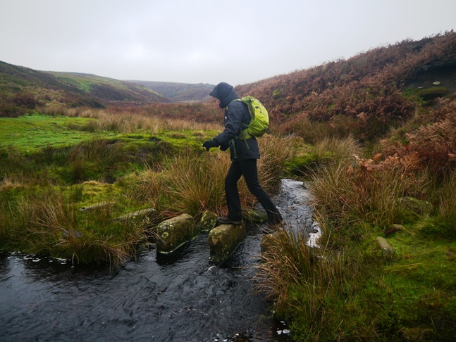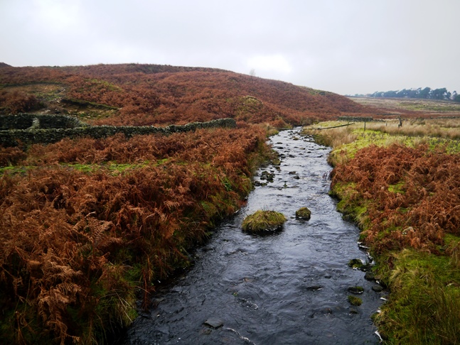 Thankfully there was a footbridge crossing the river - otherwise it would have been a very short walk! On the other side the path quickly disappeared in the dying bracken. After a bit of pathless bracken bashing we found a quad track that led us up past a modest gritstone crag before joining on to the shooter's track leading from Humberstone Bank to Alma Hut.