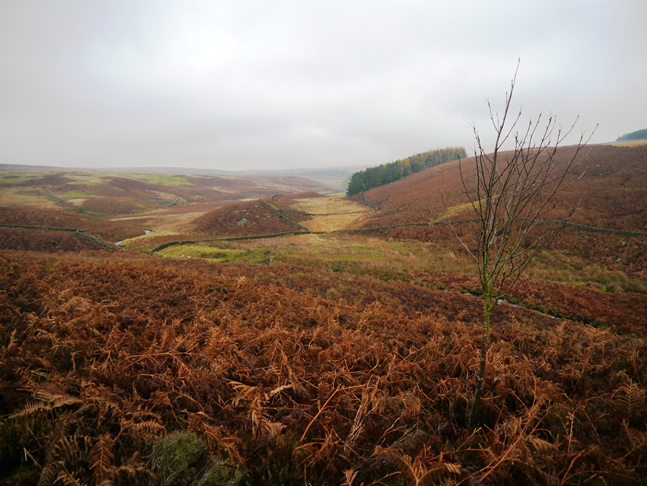 Thanks to the power of Google Street View I managed to find a layby on Hoodstorth Lane, to the north-west of Thruscross Reservoir, which would provide a convenient place to start the walk. From the layby we headed west up the lane to Red Gate where we briefly joined Skyreholme Bank before taking a path doubling back down to the river. It was a murky start to the day but even the poor visibility couldn't completely disguise the colorful nature of this part of the upper Washburn valley.