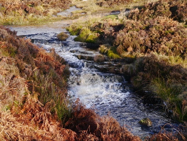 After just a few minutes at the Carle Tower another hail shower came along. After taking shelter behind the tower for a short while I realised the shower wasn't going anywhere quickly so I wrapped up and headed off across the pathless moor towards Wolf Crags. I wasn't sure what to expect with these but they proved to be a tumble of quite large boulders. Had the weather been slightly more clement I'd have spent a bit longer exploring the rocks. As it was I didn't hang around long and continued over some particularly soggy moorland to reach a section of the Ripon Rowel Walk just below Stock Beck.
