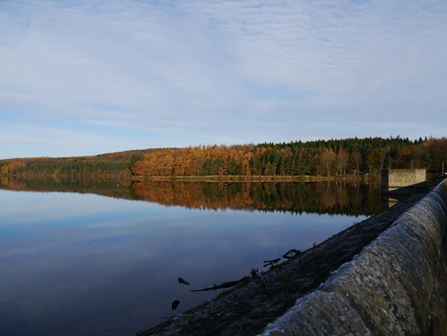 Heading back down to the reservoir path I found a nice tree stump to pose on for some more pictures before continuing along enjoying the lovely autumn colours. Crossing over the dam it was then a simple walk back along the other side of the reservoir this time with some beautiful views back to the wooded shore line that I'd walk alongside earlier.