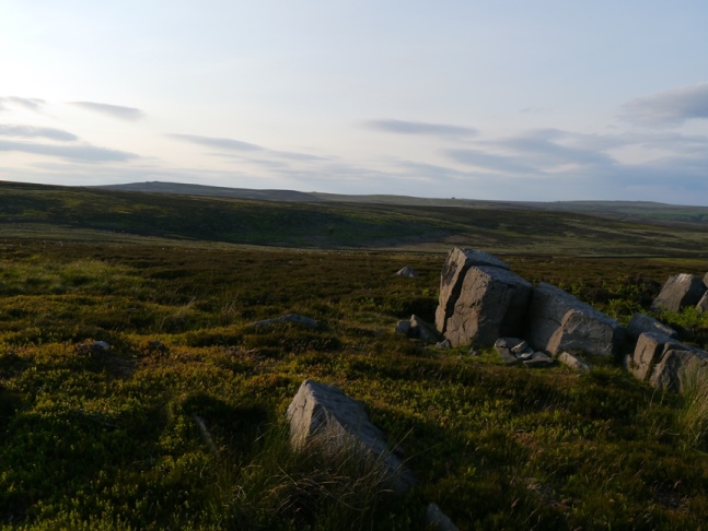 Although modest in size the Raven Stones were nicely situated with extensive views to the west and to the south and were definitely worth the effort to reach them. To get from Raven Stones to Rocking Hall required a fair bit of pathless heather bashing. Along the way I passed the unremarkable Even Stones. More memorable was the extensive patches of cotton grass and the almost constant calls of various moorland birds including lapwings, golden plovers, curlews, oystercatchers, meadow pipits and skylarks. I also think, but could not be completely certain, that I saw a merlin.