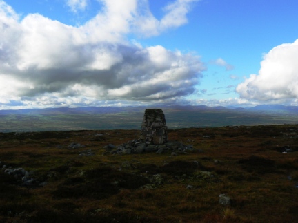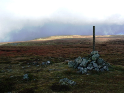 The summit of the fell is marked by a large cairn with a stake in it. The ground in the immediate vicinity is rather flat and the views are mainly of the upper slopes of the surrounding North Pennine heights of Knock Fell, Meldon Hill, Mickle Fell and Murton Fell. A much better viewpoint is from the stone built trig point to the south west which is much closer to the edge of the plateau.