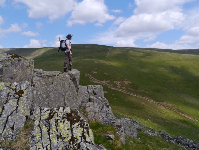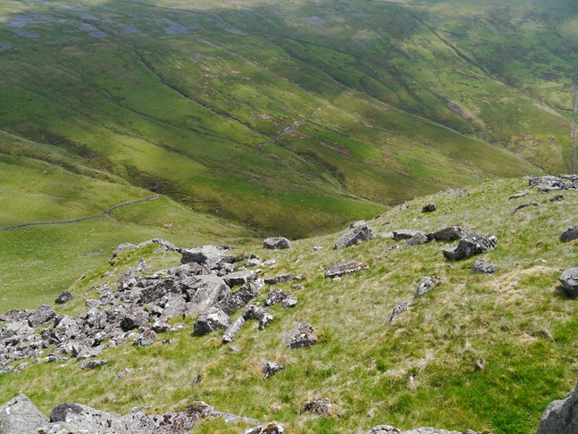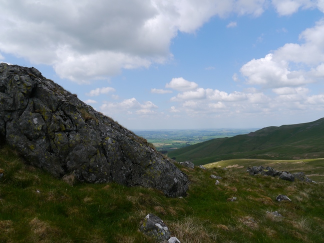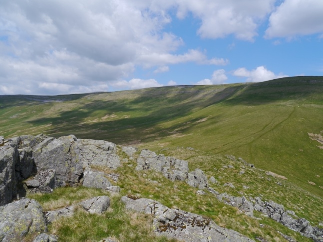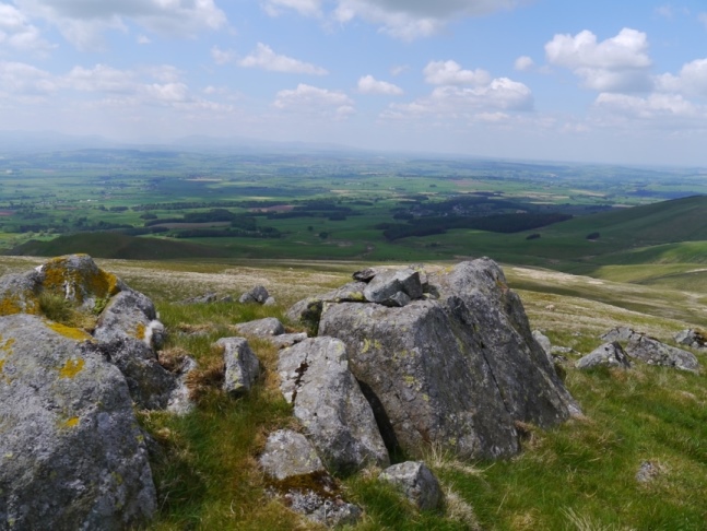 The summit of Cuns Fell is probably the rockiest to be found in the North Pennines and this is the fell's chief attraction. Indeed if the presence of rock alone is the guide to the quality of a summit then Cuns Fell would be judged to have the finest summit in the North Pennines. The view eastwards is severely restricted by what is instead a very impressive prospect of the western flanks of Melmerby Fell. The view westwards incorporates the northern fells of the Lake District with Blencathra particularly prominent. One of the most impressive views from Cuns Fell is down the precipitous south-eastern slopes into the short steep-sided valley of Ousbydale.