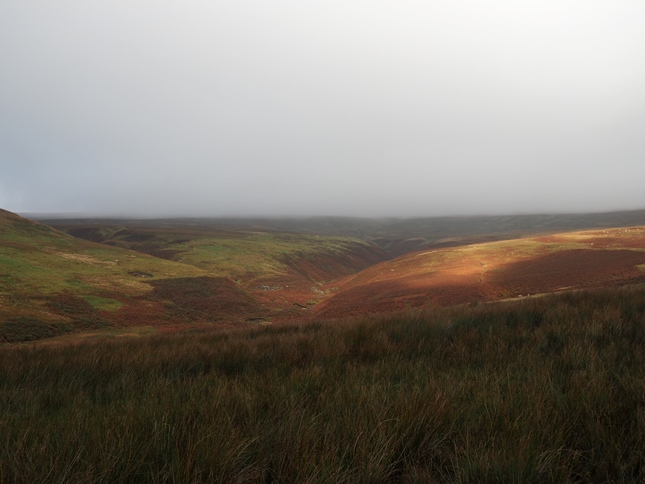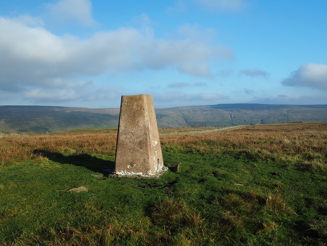 After lunch we briefly followed a thin gamekeepers path above the crags. Along the way we passed a remarkable line of peat hags all of which were badly eroded on the side overlooking the valley below. Eventually we arrived at the summit of Westernhope Moor which is marked by a trig point next to a fence above a badly waterlogged shooting track. The cloud base was just caressing the top of the fell and above us the sun was still gainfully trying to break through.