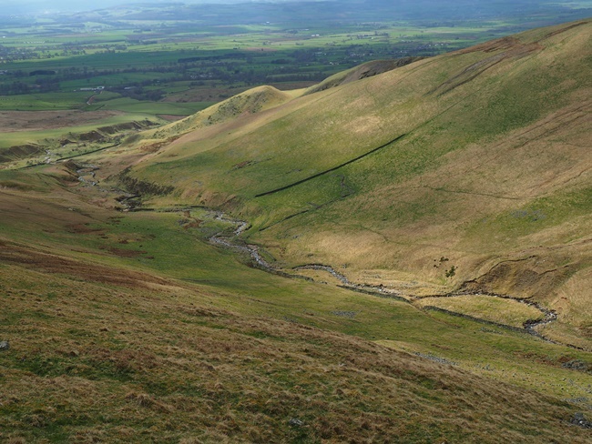 By this time I'd dropped down to the bridleway that climbs over the north flank of Cross Fell between Garrigill and Kirkland. Descending gradually towards the latter I had a panorama of Lake District fells directly ahead of me. The highlight of the descent though was the arrival above the small valley of Ardale and some dramatic views to the head of the valley which is called Black Door.
