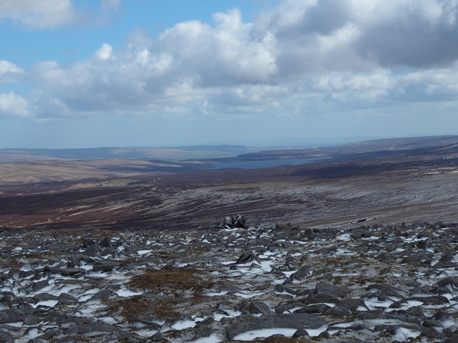 Climbing gradually along the southern flank of Cross Fell I passed the only person I would see for the next few miles. Not long afterwards I lost the path in the rapidly melting snow. By this time though I was close enough to make a beeline for the rocky rampart that surrounds the summit plateau. Scrambling carefully over the boulders my arrival on the plateau coincided with Cow Green Reservoir and upper Teesdale coming into view.