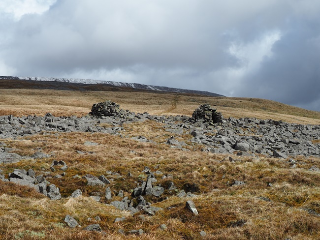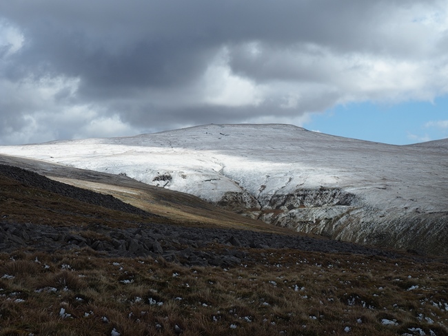Continuing on across the narrow Cringle Moor I passed the remote farmhouse at Wythwaite. A gradual climb up the side of Grumply Hill above Littledale Beck then brought me to the steeper slopes of Wildboar Scar. Visibility was superb and looking back beyond Blencarn I could clearly make out a host of Lakeland fells with Blencathra the most prominent. After a steep pull up above Wildboar Scar the bridleway became fainter. At the same time the views of the neighbouring North Pennine tops began to open out. With a white veneer from some overnight snow both Little Dun Fell and Great Dun Fell looked particularly impressive.