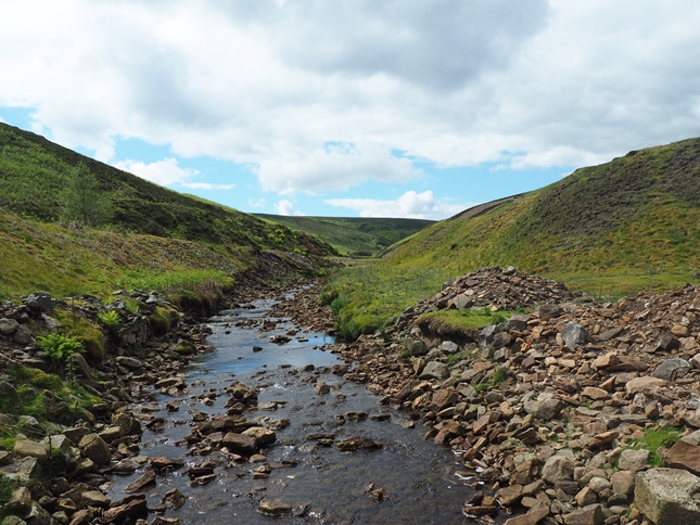 This was a lovely section of the walk and the easiest underfoot. The broad track led me deeper into the valley leading eventually, after fording the beck, to spoil heaps and some old mine workings. Just past a couple of old mine buildings, where the track re-crosses the beck at a bridge I decided to stop for some lunch. I was just contemplating how quiet and peaceful it was when a steady stream of walkers appeared, walking towards me down the valley before taking the path opposite up Wire Gill. It turned out that they were all doing the 30-mile Durham Dales Challenge and I'd probably picked the one day of the year that I would have seen someone else up there.