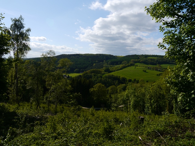 Just before the track exited the woods I then took a path (not marked as a right of way on the map but seemingly open to the public) which led through some more woodland to Mount Snever Observatory standing near the edge of Snever Scar. According to a tablet on the north side of the observatory it was built by John Wormald in 1837, the first year of Queen Victoria's reign. It is a curious building as the door is located on a large ledge six feet off the ground with no steps leading up to it. I managed to climb up but sadly the door was locked. This was a shame as the surrounding woods meant that only tantalising glimpses of the extensive view from the edge could be seen. As the top of the observatory extends above the tree line it would make an excellent viewpoint.