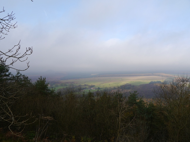 Half way along Grain Slack we turned north to follow a path up Dargate Slack to eventually reach the viewpoint on Crosscliff Brow. Although patches of blue sky were beginning to appear overhead the low cloud restricted the view somewhat. Without much to see and having timed our arrival at the viewpoint with a large party of other walkers we headed west on the broad track along Crosscliff Brow which here also doubles up as part of the long distance Tabular Hills walk.