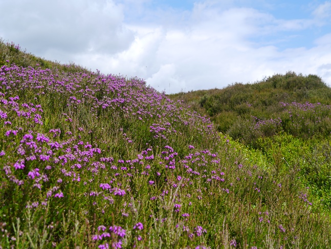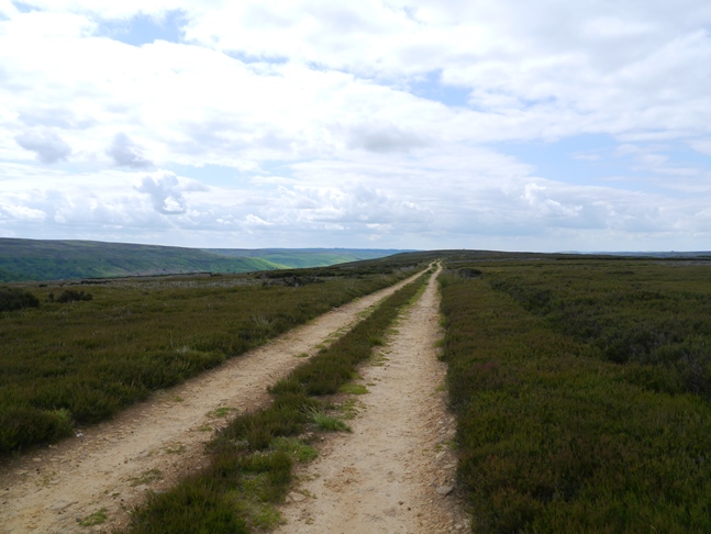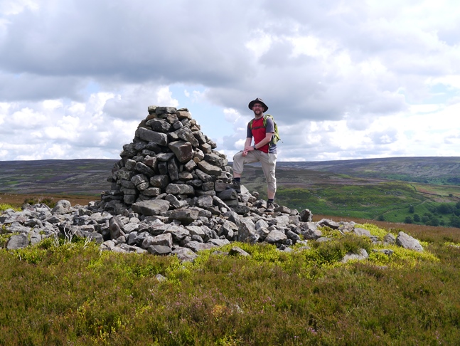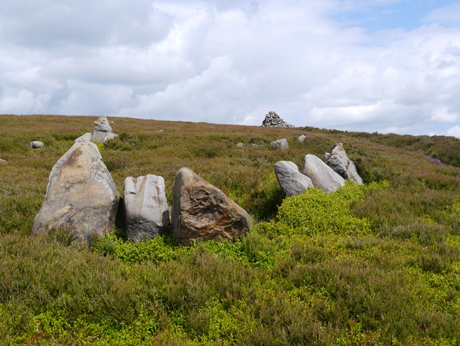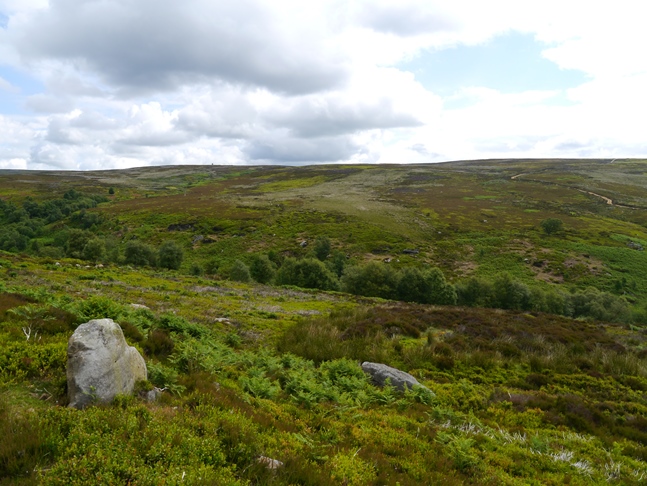 The walk up to and along Kay Nest was quite lovely with great views of the valley, the only slight disappointment was that the crags themselves were largely hidden by trees, heather and bilberry. Denied a nice outcrop for me to pose on I continued along to reach a dusty shooting track which dropped down to cross Tripsdale Beck and then wind up the other side, eventually leading to the broad crest of Nab End Moor. At a junction I followed the track south on a fine stride along Nab Ridge to eventually reach a large ancient cairn below which are situated a number of small standing stones known as the Bride Stones. The view of the Bilsdale region of the moors from the cairn and the Bride Stones was quite excellent.