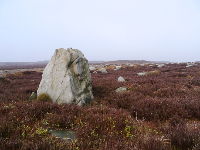 Upon reaching the wide track of Westside Road it was a straightforward walk north to the trig point. As I wanted to give the weather as much chance as it could to clear I dallied a little bit trying to take close up photos, with varying degrees of success, of some of the moorland heather. I also left the path briefly to explore a surprisingly stony area near a lot of heathery mounds that looked like many of the tumuli to be found on the moors in these parts but were unmarked on my map.