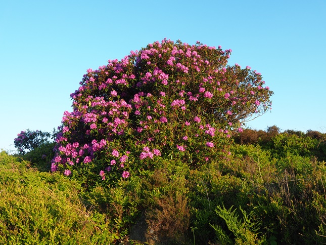 Emerging into a more open moorland I visited some more rocky outcrops loitering for a while on one with a particularly fine view of Darley Dales. I later discovered this outcrop is known as the Duchess of Sutherland Stone (though I've no idea why it is called that). A recurring feature of this latter stage of the walk were the large and fairly random clumps of rhodedendrons growing amongst the heather and bracken. Finally a track led me back to the Cork Stone and the start of the walk.