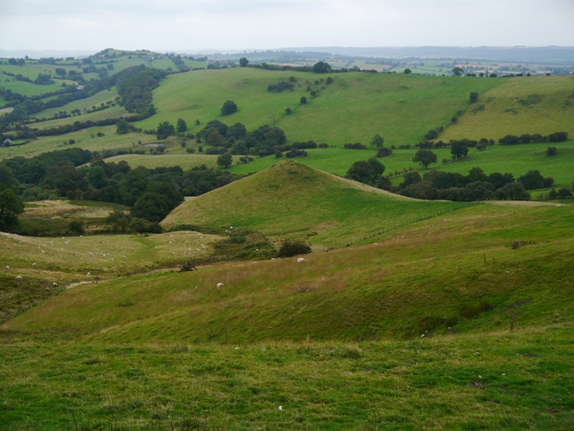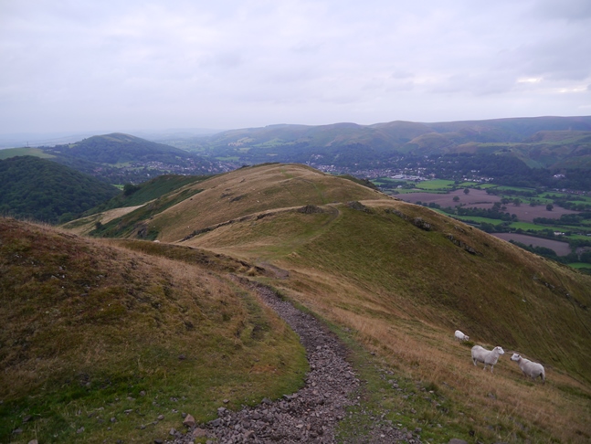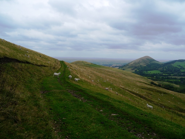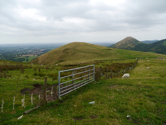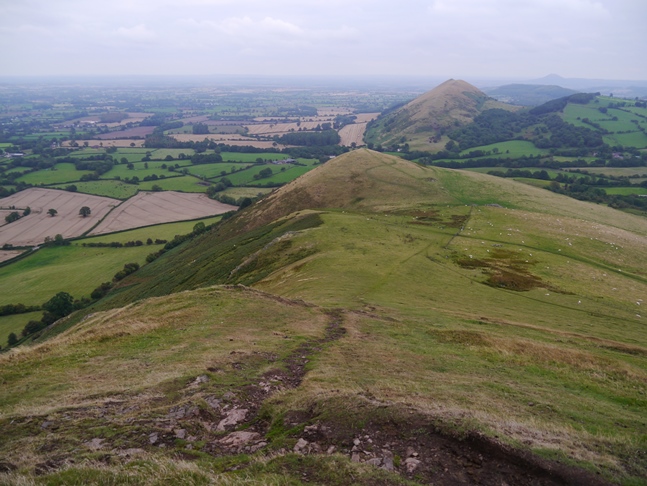 Not far past Cwms Cottage I left the main track by a stile and was faced with a choice of two routes. In the end I decided not to follow the fork descending all the way to Comley but instead took a path which after a short climb contoured beautifully around the slopes of Caer Caradoc to reach the col with Little Caradoc. The views really began to open out on this section especially towards The Lawley and beyond to The Wrekin. Below the path to the right there also the prominent grassy hump marked on the map as Robin's Tump.