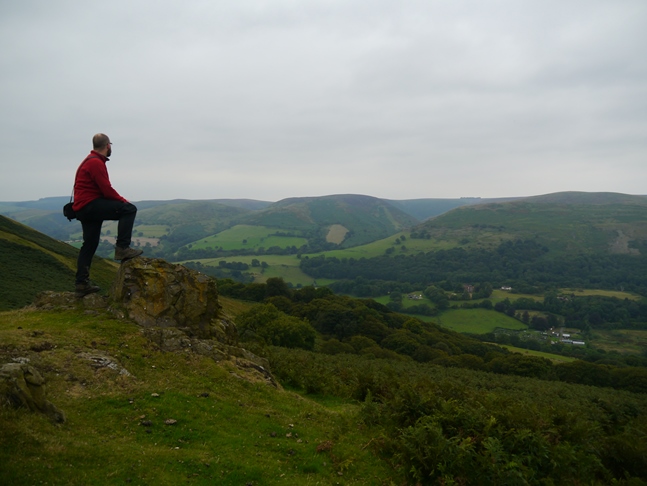 Emerging out of the woods on a back road it was then a short but relatively steep grassy pull up on to the main ridge of Ragleth Hill. Heading north a short way I rang Lisa and Rhiannon as they could see the point where I was standing from the front window of the cottage. After doing a couple of star jumps they spotted me and I noticed the flash of her camera as Lisa tried to take a picture of me.