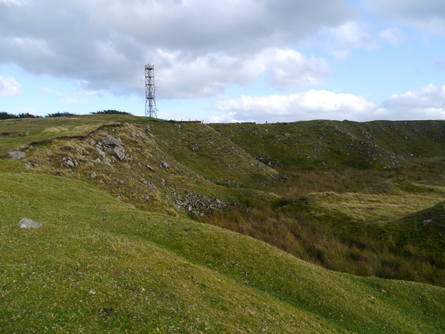 From Brown Clee Hill I dropped down to join the Shropshire Way which I followed on to the neighbouring top of Clee Burf. The summit of the latter proved to be unmarked but a few rocks gave it some character and again the views were superb especially towards Titterstone Clee Hill which looked particularly fine from this angle. From the top of Clee Burf I followed the rim of some nearby quarries to cross an access road to visit a prominent cairn that had an excellent view across this part of Shropshire towards Wenlock Edge and beyond to the Long Mynd.
