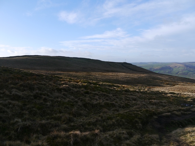 Nor Hill seemed much more prominent than the map suggests and there was a good view back towards the top of the moor. From Nor Hill I dropped down through a broken wall and down a steeper section towards Moor Lane. To access Moor Lane I had to cross a wall at grid reference SE026512. I could have avoided the wall crossing and the rougher section of the walk if I'd chosen to do a slightly longer route via High Edge and Snow Hill Farm. On the other hand this would have meant walking through farmyards and fields, not a prospect that appealed to me.