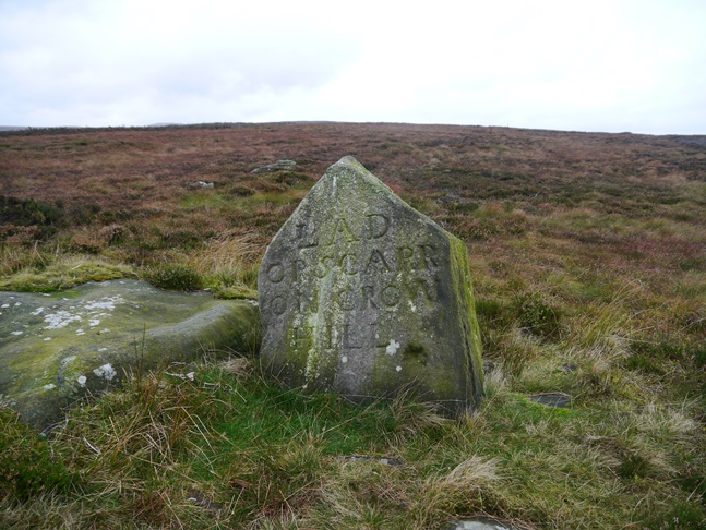 Having walked around the top of Ponden Clough I descended slightly towards Upper Ponden before cutting across the moor to reach the quarry track. This led easily up to the remains of some old delphs, now largely covered in heather. Just above the old quarry remains I came across a large boundary stone engraved with, 'Lad or Scarr on Crow Hill'.