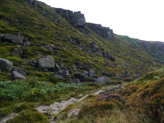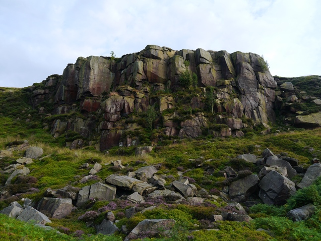 Starting from the Cow and Calf car park I first spent some time exploring the Cow and Calf rocks and soaking in the views of Ilkley and lower Wharfedale. Eventually turning my back on the popular landmark I set off towards Ilkley Crags, another excellent gritstone feature but, being set back that bit further back, much quieter than the Cow and Calf rocks. One of the great things about Ilkley Moor is the myriad of possible route options and on this occasion I reached Ilkley Crags first by taking a path in a small dip marked on the map as 'Rocky Valley' which runs below the imposing crags above.