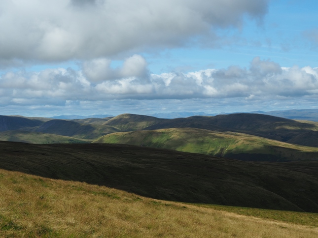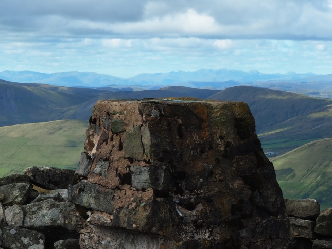 From the line of cairns we headed north-west across Wild Boar Fell's flat and fairly wet summit plateau to reach the summit, marked by a trig point within a stone shelter. While the summit lacks the drama of the Nab it is still a very fine spot, particularly so in the conditions we enjoyed where the visibility was so good it would have been easy to identify the multitude of Lake District fells away to the west.