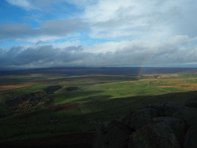 A brief patch of sunshine and accompanying rainbow to the north briefly sent me scurrying for a better vantage point to take some photos but thereafter conditions continued to deteriorate. As low cloud drifted over the summit I decided to head back, retracing my earlier steps all the way back to the start.