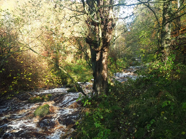 My attempt to carry on along the thin path to the next footbridge was foiled by a large section of the path having been submerged in the torrent. Therefore I had to retrace my steps to the footbridge and clamber up the bank to the main path. Ten minutes later, having now crossed the second footbridge, I made another detour to visit the second waterfall. Witnessing the stream in these conditions it became easy to imagine the storm surge in 1836 that caused so much damage that the gill was called 'The Valley of Desolation'.