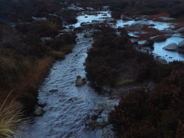 Five minutes after returning to the main path I left the woods and Posforth Gill behind to begin the climb over Barden Moor on to Simon's Seat. By this time the skies had largely clouded over again giving the next stage of the walk a rather sombre feel. It was also hard to escape wet feet, not just crossing the ford over Great Agill Beck but also the numerous streams crossing the path at Great Agill Head. Further up, not far from the summit, an entire section of path had turned into a running stream.