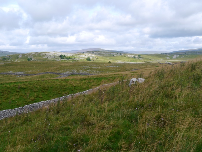 Starting from the Devonshire Hotel we walked up the main street to Town Head before leaving Grassington via Chapel Street and Bank Lane. From a junction of paths we took the option heading north across the area marked as Kimpergill Hill on the map. The grassy path, initially between drystone walls, climbed nicely up through limestone pastures. One thing to note is that it is easy if not paying attention, as I initially wasn't, to continue following the path alongside the wall at grid ref SE002653 and miss the point where actual right of way branches off and climbs to a small gate stile.