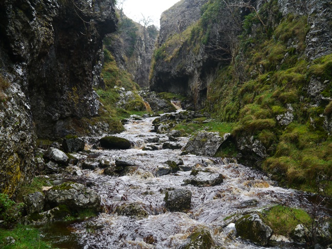 The first time I went down Trollers Gill it was wet but passable, the second time I visited in the summer of 2005 it was hot and dry as a bone. On this occasion we arrived at the entrance to find it was in flood and, unless we wanted to wade up the swiftly flowing stream and cross lots of slippery rock, completely impractical as a walking route. Discretion being the better part of valour we decided not to risk it. On the one hand this was a shame because I'd been particularly looking forward to this section of the walk. On the other hand my disappointment was balanced by the stunning sight of seeing the ravine in flood.