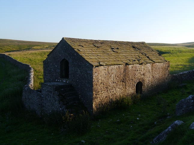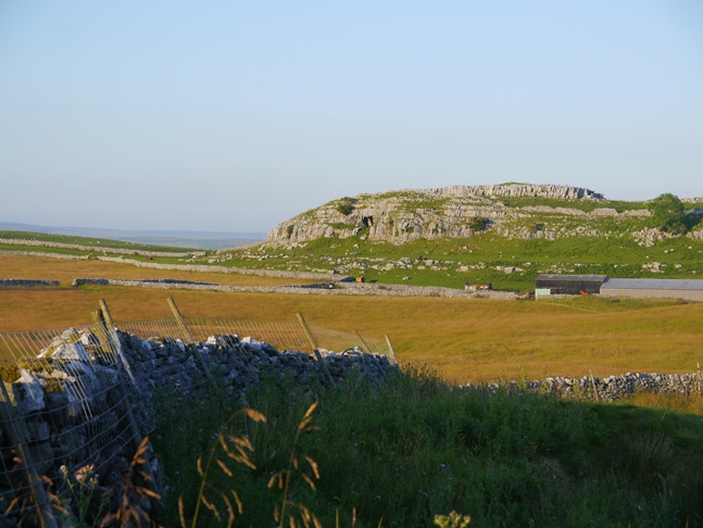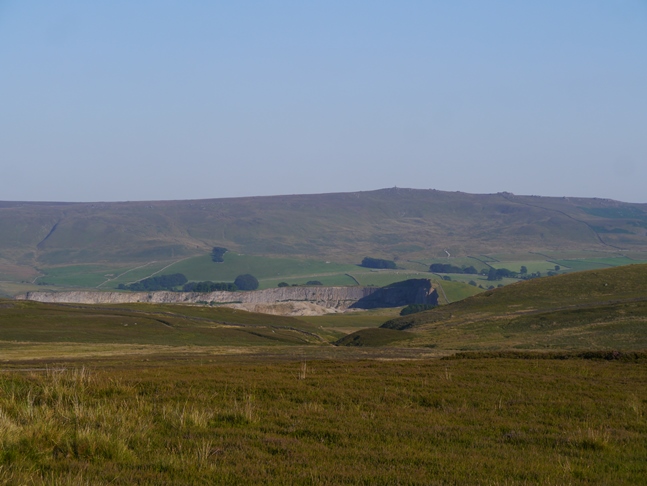 Continuing along the track climbing gently and fairly uneventfully I then came to a junction with another bridleway which I followed north across Threshfield Moor and over High Moss to reach a sudden change to limestone scenery at Higher Heights Holes. Passing an old barn I walked up to some limestone outcrops to eat my tea before starting the return walk via Height Laithe and Height House. The dominating feature of this part of the walk was the nearby Cave Scar with the dark opening of Height Cave clearly visible from a distance.
